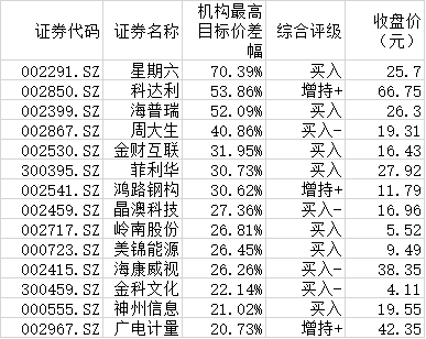 評(píng)級(jí)機(jī)構(gòu)對(duì)上述101家公司中的75家給予了推薦評(píng)級(jí),占比74.26%。數(shù)據(jù)進(jìn)一步顯示,有33家公司股票最新收盤價(jià),較機(jī)構(gòu)推薦目標(biāo)價(jià)還有差距,其中,有包括星期六(70.39%)、科達(dá)利(53.86%)、海普瑞(52.09%)等在內(nèi)的14只個(gè)股距機(jī)構(gòu)最高目標(biāo)價(jià)還有超過20%的價(jià)差,值得投資者密切關(guān)注。