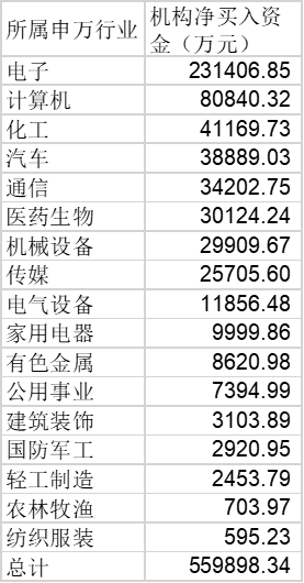 從行業(yè)屬性來看,上周機(jī)構(gòu)專用席位凈買入的74只個股中,流入電子與計(jì)算機(jī)行業(yè)的資金最高,分別達(dá)到23.14億元和8.08億元,合計(jì)31.22億元,占機(jī)構(gòu)買入總額的29.98%,即有近三成機(jī)構(gòu)專用席位凈買入資金流入電子與計(jì)算機(jī)行業(yè)。