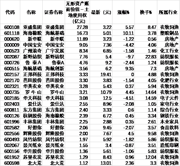 綜合來(lái)看,農(nóng)地儲(chǔ)備多的企業(yè)受到了更多的關(guān)注。《證券日?qǐng)?bào)》研究部通過(guò)同花順對(duì)市場(chǎng)中土地流轉(zhuǎn)板塊公司進(jìn)行統(tǒng)計(jì),顯示板塊51只成份股中,有26只無(wú)形資產(chǎn)賬面價(jià)值(土地使用權(quán))超過(guò)1億元,其中,亞盛集團(tuán)(27.28億元)、海航基礎(chǔ)(16.73億元)、新華聯(lián)(11.89億元)等3只個(gè)股過(guò)10億元。