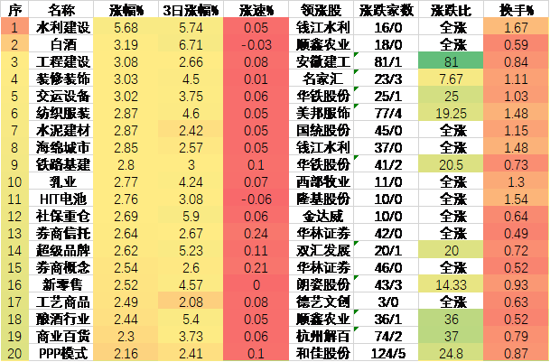 從板塊走勢來看,截至上午收盤,有326類板塊上漲,占比96.17%,水利建設(shè)(5.68%)、白酒(3.19%)、工程建設(shè)(3.08%)等板塊居前3位;有11類板塊下跌,昨日連板(-2.87%)、農(nóng)業(yè)種植(-2.12%)、昨日觸板(-1.91%)等板塊居前3位。