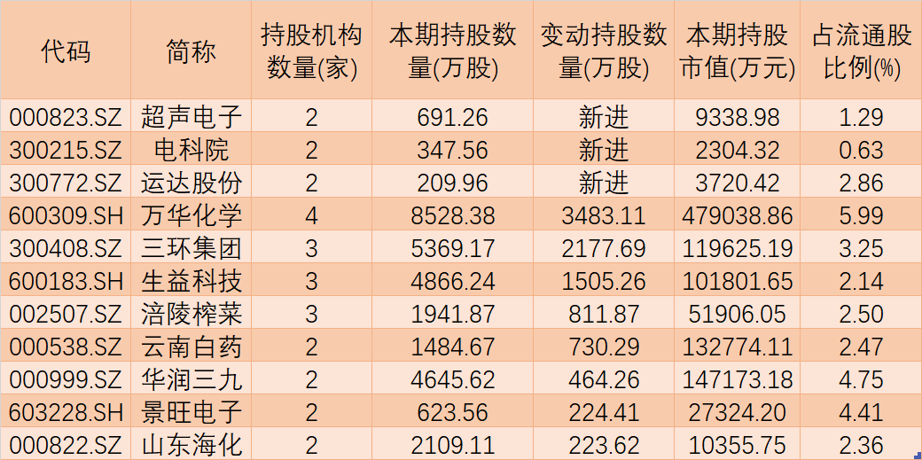 值得一提的是,進一步梳理發(fā)現(xiàn),上述37只個股中,社?;鹨约癚FII兩類機構(gòu)合計增持了11只個股,增持資金達到40.37億元。具體來看,截至去年四季度末,社?;鹋cQFII共同新進持有超聲電子、電科院、運達股份等3只個股,合計新進持股數(shù)量分別達到691.26萬股、347.56萬股和209.96萬股;萬華化學、三環(huán)集團、生益科技等3只個股期間社?;鸺癚FII合計增持股份數(shù)量均逾1000萬股,分別為:3483.11萬股、2177.69萬股、1505.26萬股,涪陵榨菜、云南白藥、華潤三九、景旺電子和山東?;?只個股去年四季度社保基金及QFII合計增持數(shù)量也均在200萬股以上。