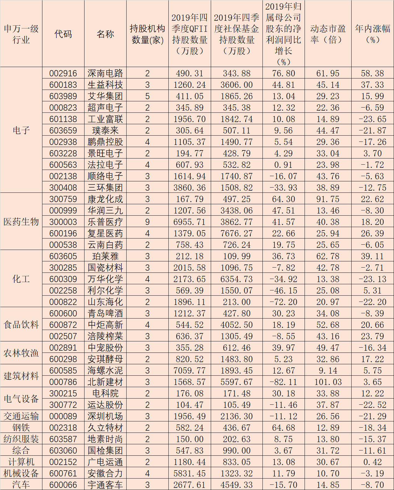 從整體持股情況看,社?;鹋cQFII兩類機構(gòu)對高成長低估值的品種更加青睞。社?;鹋cQFII在去年四季度共同持倉的37家公司2019年業(yè)績表現(xiàn)普遍較好,有26家公司2019年年報凈利潤實現(xiàn)同比增長,占比逾七成。深南電路、久立特材、康龍化成、華潤三九、生益科技、樂普醫(yī)療、中寵股份、珀萊雅、青島啤酒、電科院等公司去年歸屬母公司股東的凈利潤同比增長均達到30%以上,顯示出較高的成長性。從估值來看,上述26只實現(xiàn)2019年凈利潤同比增長的個股中,有12只個股最新動態(tài)市盈率均不足30倍,具有較高的安全邊際。