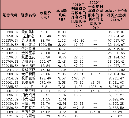 進(jìn)一步梳理發(fā)現(xiàn),截至4月26日,北上資金本周凈買入的21只活躍股中,有16家公司已披露2019年年報,其中,14家公司2019年凈利潤實現(xiàn)同比增長,牧原股份2019年凈利潤同比增幅最高,達(dá)到1075.37%。此外,5家公司披露2020年一季報業(yè)績均實現(xiàn)凈利潤同比增長,大北農(nóng)一季度凈利潤同比增長高達(dá)1298.16%,緊隨其后的東方財富一季度凈利潤也實現(xiàn)同比翻番,達(dá)到126.48%。