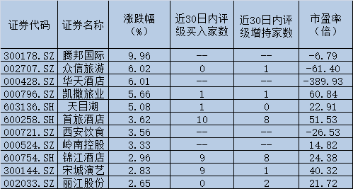 進(jìn)一步梳理發(fā)現(xiàn),部分旅游餐飲股近30日內(nèi)均受到天風(fēng)證券、東北證券等多家機(jī)構(gòu)看高一線。其中,中國國旅、首旅酒店、錦江酒店、中青旅、宋城演藝、峨眉山A等6只個股期間均受到券商10次及以上給予“買入”或“增持”等看好評級,后市表現(xiàn)值得密切跟蹤。