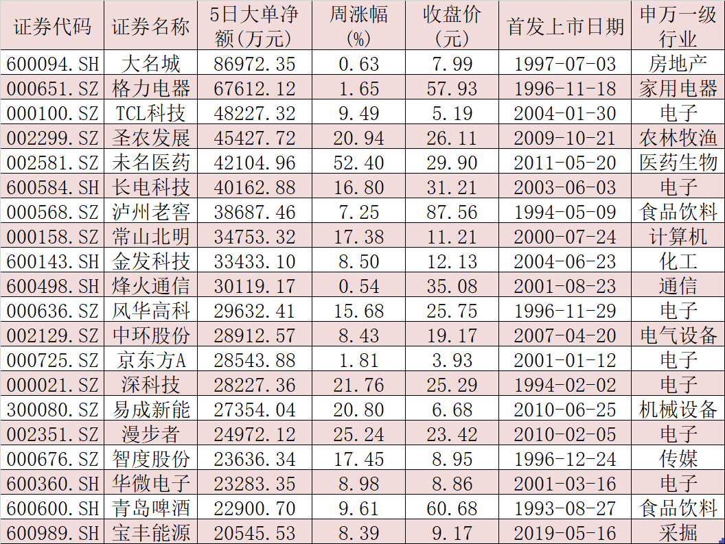 記者進一步統(tǒng)計發(fā)現(xiàn),本周,有50只個股累計大單資金凈流入均超過1億元,大名城、格力電器、TCL科技、圣農(nóng)發(fā)展、未名醫(yī)藥、長電科技、瀘州老窖、常山北明、金發(fā)科技、烽火通信等10只個股期間均受到3億元以上大單資金追捧,包括風華高科、中環(huán)股份、京東方A、深科技等在內(nèi)的40只個股期間累計大單資金凈流入也均逾1億元。