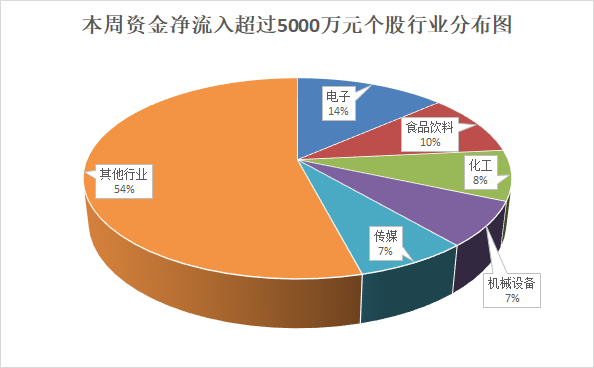 行業(yè)角度來看,上述本周實現(xiàn)大單資金凈流入超過5000萬元的111只個股主要扎堆在電子、食品飲料、化工、機械設備、傳媒等五行業(yè),涉及個股數(shù)量分別為:15只、11只、9只、8只、8只。