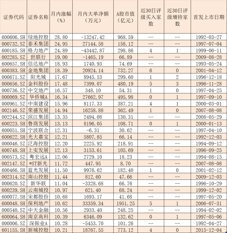 表:部分房地產(chǎn)股月內(nèi)市場表現(xiàn)
