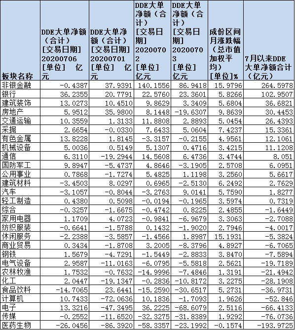各路資金展開了調(diào)倉換股。7月以來的4個交易日中,市場呈現(xiàn)出資金凈流入態(tài)勢。從申萬一級行業(yè)來看,非銀金融和銀行等兩行業(yè)期間資金凈流入均超百億元,分別為264.6億元和102.9億元,合計(jì)達(dá)367.5億元,成為資金追捧的重點(diǎn)領(lǐng)域。而此前漲幅居前的醫(yī)藥生物行業(yè)期間累計(jì)資金凈流出達(dá)193.9億元。