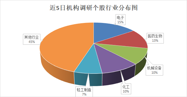 從行業(yè)角度來看,上述近5日獲得機構(gòu)調(diào)研的71只個股主要扎堆在電子、醫(yī)藥生物、機械設(shè)備、化工、輕工制造等五行業(yè),涉及個股數(shù)量分別為11只、9只、7只、7只、5只。
