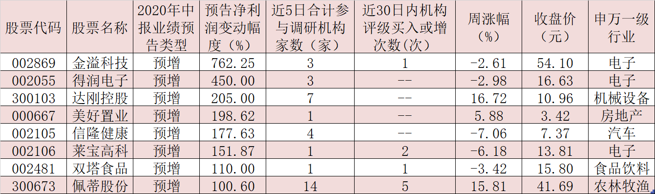 除此之外,還有32家公司也披露2020年半年報業(yè)績預(yù)告,業(yè)績預(yù)喜公司共有20家,占比逾六成。金溢科技、得潤電子、達剛控股、美好置業(yè)、信隆健康、萊寶高科、雙塔食品、佩蒂股份等8家公司均預(yù)計2020年上半年歸屬母公司股東的凈利潤同比增長100%以上。