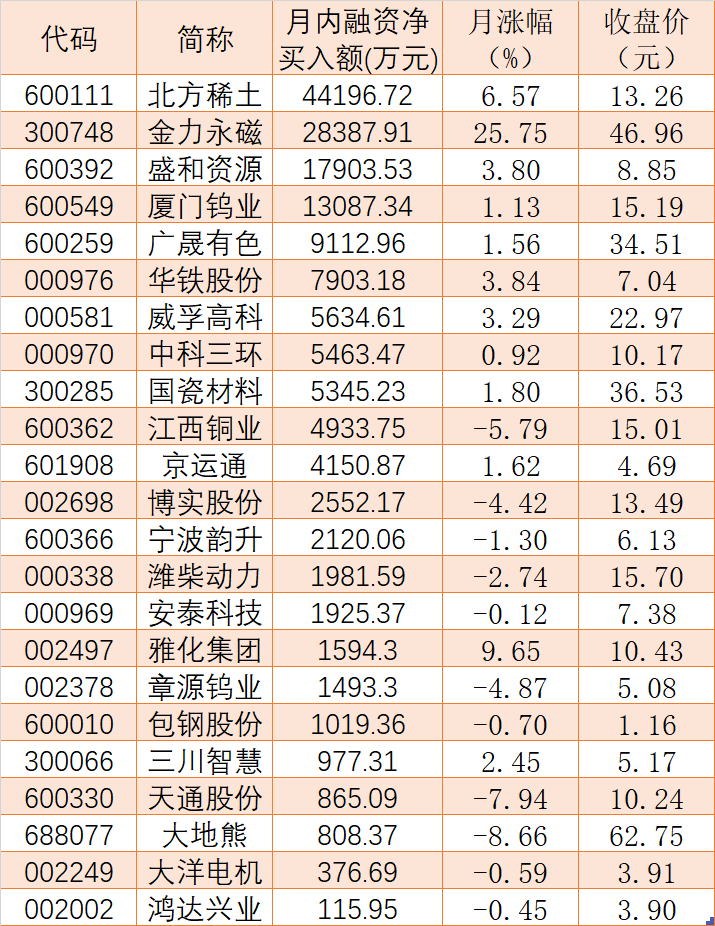 表:8月份以來受到融資客青睞的稀土永磁概念股一覽