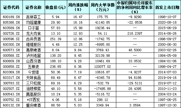 具體來(lái)看,本周以來(lái),46只食品飲料股逆市上漲,其中,吉林森工、均瑤健康、口子窖、龍大肉食、古井貢酒、維維股份等6只個(gè)股期間累計(jì)漲幅超10%。