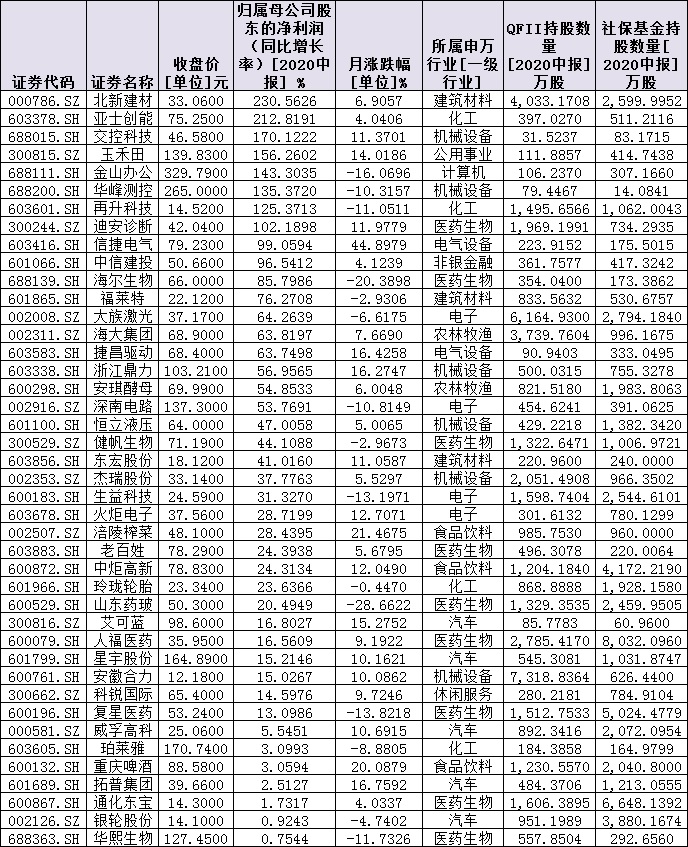 秉承長期投資、價值投資理念的社?;鸪謧}一直以來備受各方關注。在上述1110家凈利潤增長的公司中,截至今年上半年,包括順絡電子、湯臣倍健、利爾化學、廈門象嶼等在內的197家公司的前十大流通股股東名單中有社?;瓞F身。另外,有106公司的前十大流通股股東名單中有QFII現身。進一步梳理發(fā)現,有43家公司同時被社?;鸷蚎FII持有,成為兩大機構共同追捧的對象。