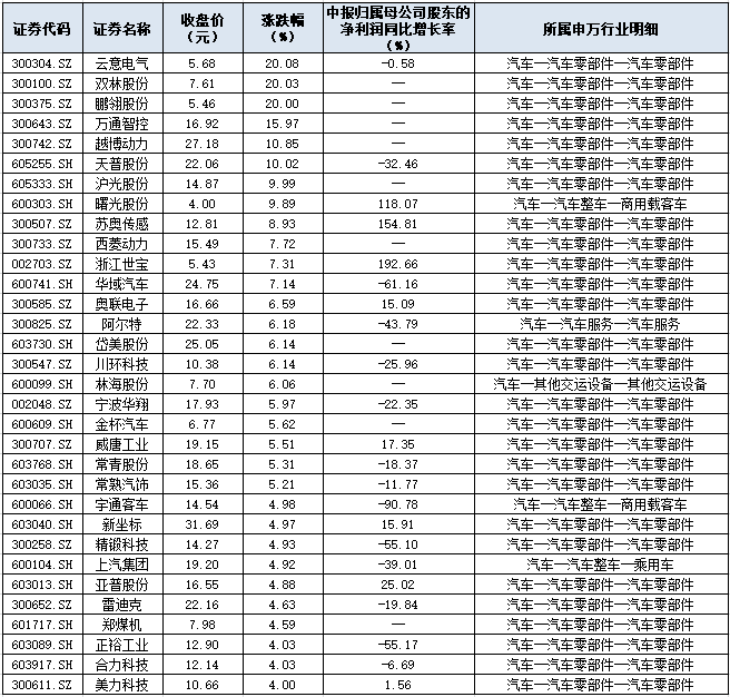 在利好消息的提振下,汽車板塊指數(shù)出現(xiàn)久違的上漲態(tài)勢,8月27日,板塊整體漲幅達到1.98%,板塊內(nèi)近八成個股出現(xiàn)不同程度的上漲,其中,云意電氣、雙林股份、鵬翎股份、天普股份、滬光股份、曙光股份等6只個股聯(lián)袂漲停。