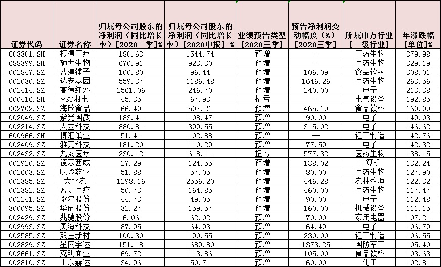 統(tǒng)計(jì)發(fā)現(xiàn),在上述110只三連增的個(gè)股中,今年以來,有78只個(gè)股跑贏同期上證指數(shù)(年內(nèi)累計(jì)漲幅11.6%),占比達(dá)70.9%。其中,振德醫(yī)療、碩世生物、鹽津鋪?zhàn)?、達(dá)安基因、高德紅外等個(gè)股股價(jià)年內(nèi)累計(jì)漲幅均超200%。另外,包括海欣食品、紫光國(guó)微、大立科技、博匯紙業(yè)、雅克科技、九安醫(yī)療等在內(nèi)的19只個(gè)股年內(nèi)累計(jì)漲幅均超100%,盡顯強(qiáng)勢(shì)。