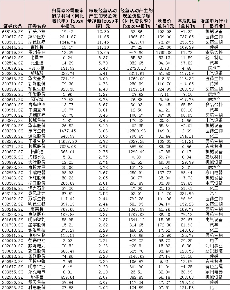 記者由此進(jìn)一步梳理發(fā)現(xiàn),在上半年凈利潤(rùn)實(shí)現(xiàn)同比增長(zhǎng)的公司中,TOP50公司(剔除銀行和非銀金融等行業(yè)的上市公司)的每股經(jīng)營(yíng)性活動(dòng)現(xiàn)金流量?jī)纛~均在2元以上,彰顯出較好的發(fā)展“錢景”。其中,石頭科技、英科醫(yī)療、振德醫(yī)療、吉比特和貴州茅臺(tái)等5家公司,每股經(jīng)營(yíng)性動(dòng)現(xiàn)金流量?jī)纛~均超10元,分別為12.89元、11.65元、11.45元、11.10元和10.05元。
