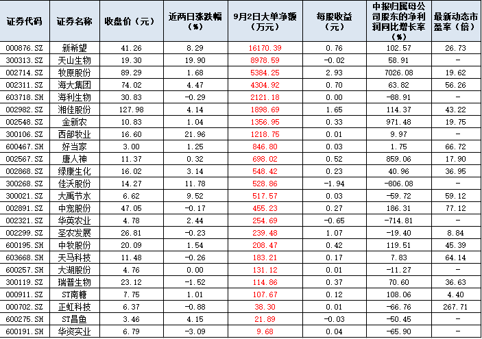 表:9月2日大單資金凈流入的農(nóng)業(yè)股市場表現(xiàn)一覽