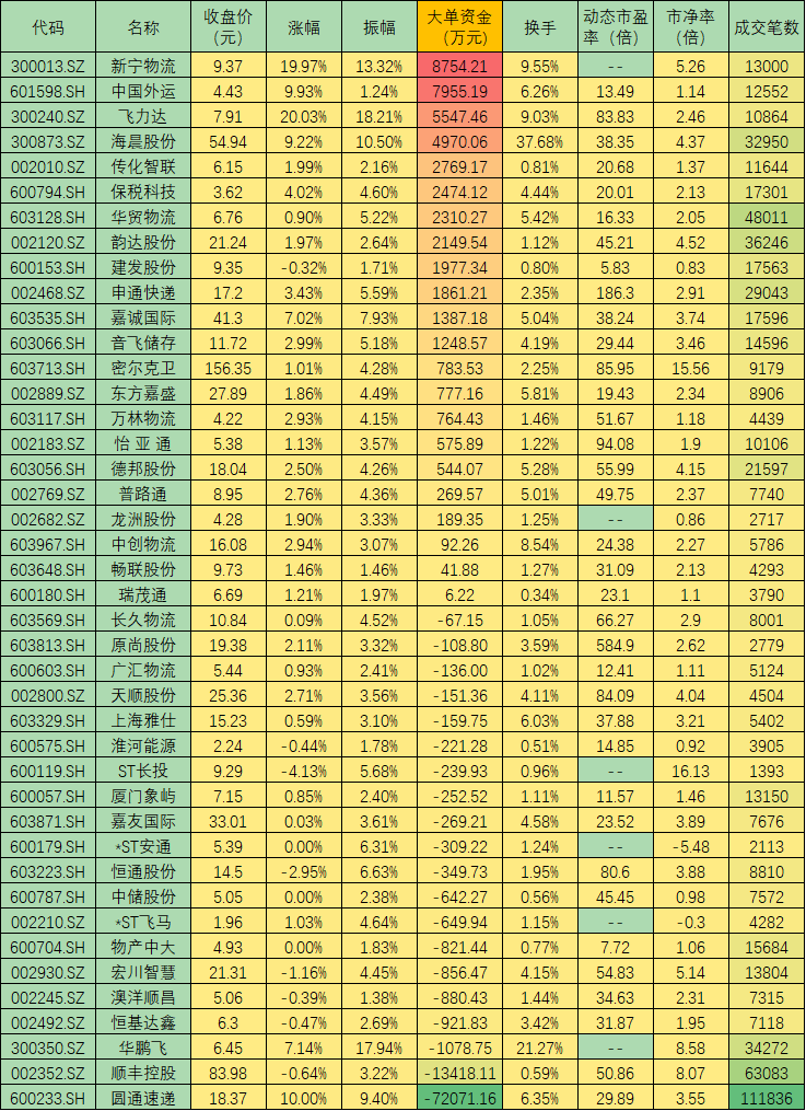 表:周三物流板塊市場(chǎng)表現(xiàn)一覽