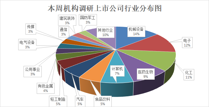 從行業(yè)角度來(lái)看,上述本周獲得機(jī)構(gòu)調(diào)研的189只個(gè)股主要扎堆在機(jī)械設(shè)備、電子、化工、醫(yī)藥生物、計(jì)算機(jī)、食品飲料、汽車(chē)等七行業(yè),涉及個(gè)股數(shù)量分別為27只、23只、20只、17只、14只、10只和10只。綜合來(lái)看,以電子、計(jì)算機(jī)為代表的科技龍頭公司以及醫(yī)藥生物、食品飲料等代表的消費(fèi)類龍頭公司仍然是本周機(jī)構(gòu)調(diào)研的重點(diǎn)。