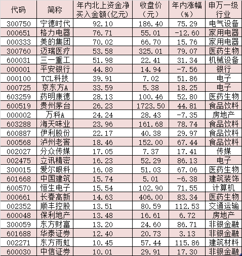 記者進(jìn)一步統(tǒng)計發(fā)現(xiàn),上述年內(nèi)實現(xiàn)北上資金凈買入的81只個股中,期間累計北上資金凈買入額超過10億元的個股有26只,寧德時代期間累計北上資金凈買入額居首,達(dá)到92.10億元,格力電器、美的集團(tuán)、邁瑞醫(yī)療、三一重工等4只個股期間均受到50億元以上北上資金搶籌,包括平安銀行、TCL科技、京東方A、藥明康德、貴州茅臺等在內(nèi)的21只個股期間累計北上資金凈買入額也均逾10億元。