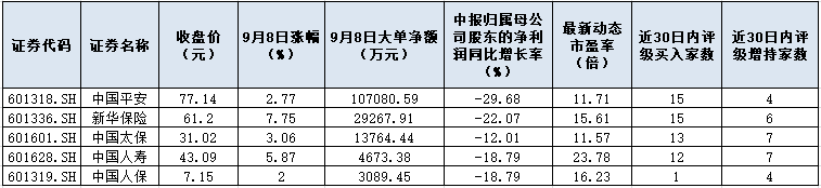 不僅如此,資金轉(zhuǎn)向低風(fēng)險(xiǎn)防御性板塊的跡象也愈發(fā)明顯。9月8日,保險(xiǎn)板塊大單資金凈流入超過15億元,位居申萬二級行業(yè)首位,其中,中國平安大單資金凈流入就達(dá)10.71億元,新華保險(xiǎn)、中國太保等兩只個股大單資金凈流入也均在1億元以上,分別為2.93億元、1.38億元,其他當(dāng)日實(shí)現(xiàn)大單資金凈流入的保險(xiǎn)股還有中國人壽和中國人保,上述5只保險(xiǎn)股合計(jì)大單資金凈流入15.79億元。