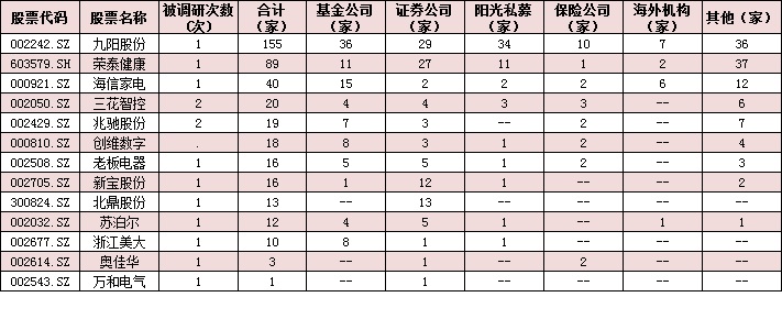 從參與調(diào)研的機構(gòu)家數(shù)來看,上述13家上市家用電器公司中,九陽股份、榮泰健康、海信家電、三花智控等4家接待調(diào)研機構(gòu)家數(shù)均在20家及以上,分別為:155家、89家、40家和20家。值得注意的是,在13家獲機構(gòu)調(diào)研的家用電器公司中,10家為中小創(chuàng)公司,占機構(gòu)調(diào)研公司比例的77%。
