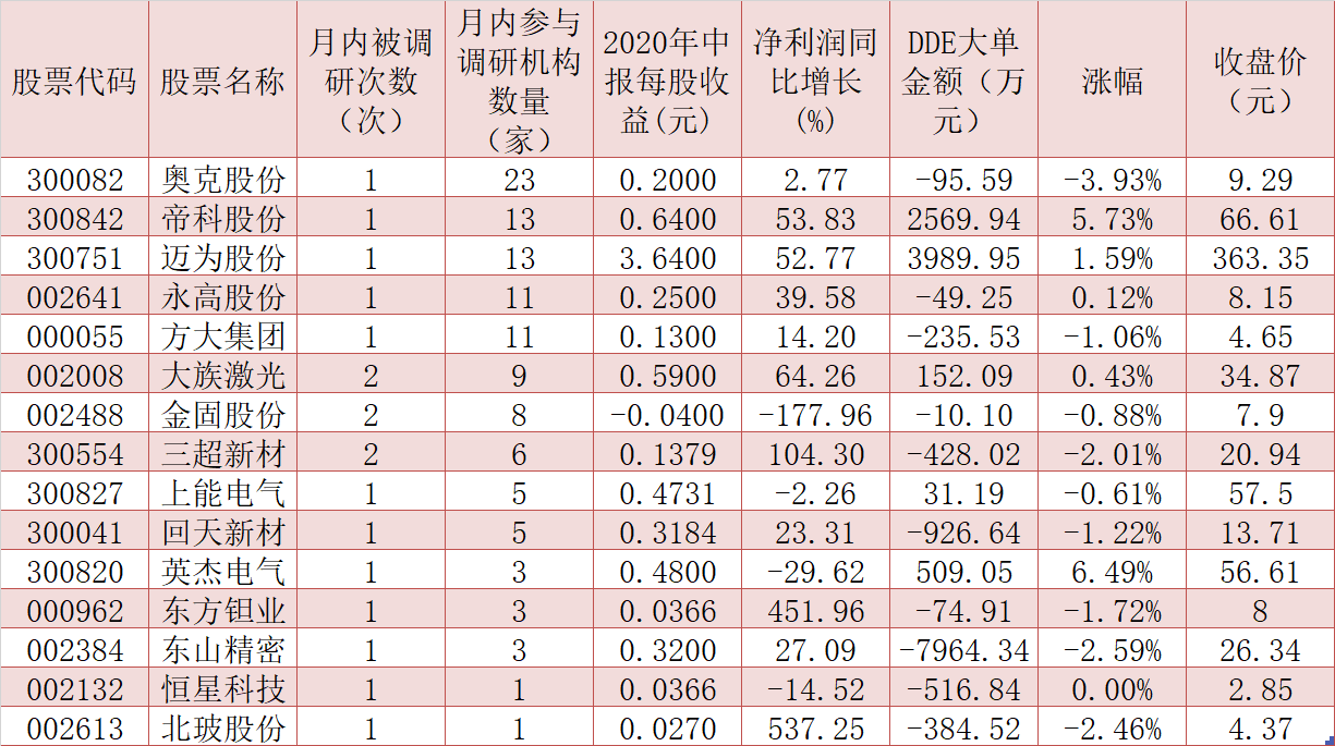 在業(yè)績逐步改善的環(huán)境下,近期機構對光伏公司調(diào)研熱情高漲,9月份以來共有15家相關上市公司獲機構密集調(diào)研,奧克股份、帝科股份、邁為股份、永高股份、方大集團等5家公司月內(nèi)均受到10家及以上機構扎堆調(diào)研,包括大族激光、金固股份、三超新材等在內(nèi)的10家公司也被機構走訪調(diào)研。