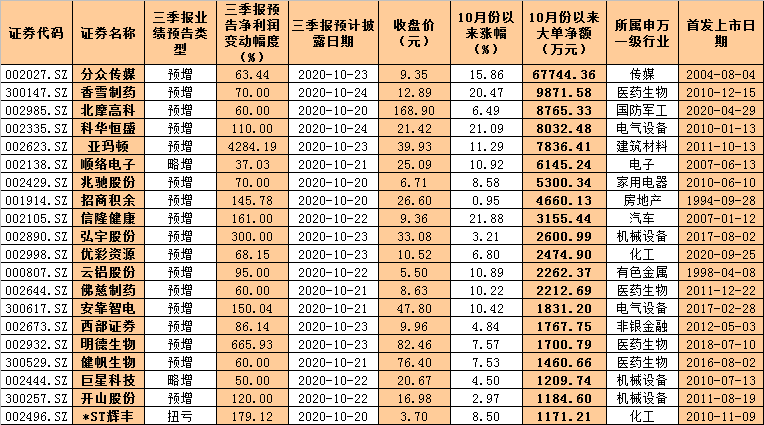 表:月內(nèi)大單資金凈流入居前的三季報預喜股一覽