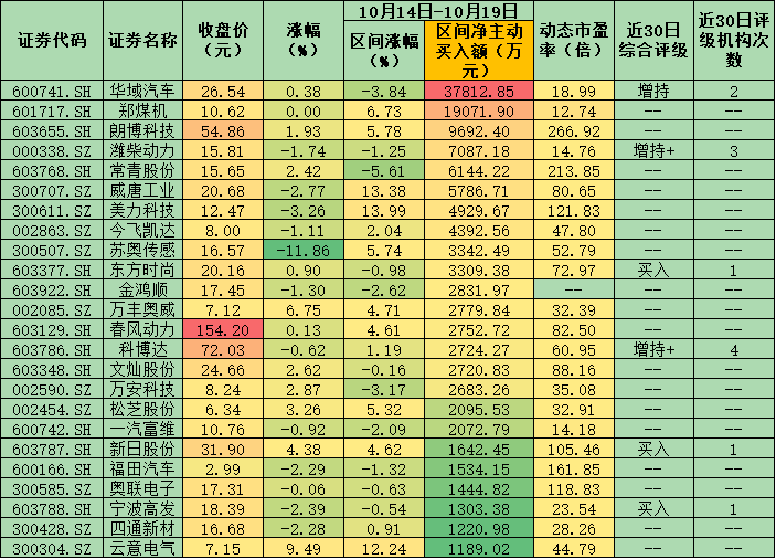 表:10月14日以來汽車板塊累計凈主動買入超1000萬元股一覽