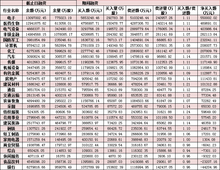 統(tǒng)計(jì)發(fā)現(xiàn),10月份以來截至10月16日,在28個(gè)申萬一級(jí)行業(yè)中,23個(gè)行業(yè)均獲融資凈買入。其中,電子、醫(yī)藥生物和電氣設(shè)備等三行業(yè),凈買入額居前均超過40億元,分別為55億元、46.97億元和40.4億元,合計(jì)達(dá)142.37億元。
