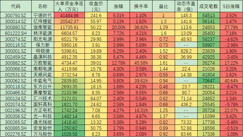 正如分析人士所言,景氣度和業(yè)績帶來了投資熱度和市場風口,同時,市場資金也開始積極布局,其中,寧德時代(41484.86萬元)、億緯鋰能(20542.37萬元)、迦南智能(11735.91萬元)等3只個股大單凈流入均超1億元,另有包括林洋能源、陽光電源、保力新等在內(nèi)的18只個股大單凈流入額均超1000萬元,以上21只個股合計大單凈流入13.43億元。