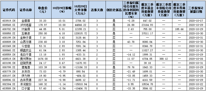 表:10月29日可交易白酒股市場表現(xiàn)一覽