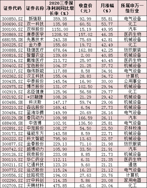 表:月內(nèi)累計漲幅超20%的三季報業(yè)績翻番股情況: