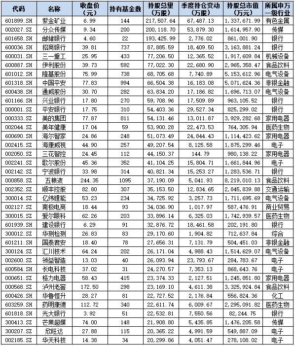 表:公募基金持股總量超2億股以上的浮盈股一覽