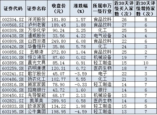 與此同時,出色的表現(xiàn)也受到機(jī)構(gòu)的高度關(guān)注。統(tǒng)計顯示,在上述66只強(qiáng)勢股中,機(jī)構(gòu)近30日內(nèi)給予“買入”或“增持”以上評級的公司達(dá)61家,占比逾九成,其中,推薦次數(shù)超過10次的公司達(dá)41家。