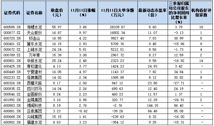 表:11月11日水泥股市場(chǎng)表現(xiàn)一覽