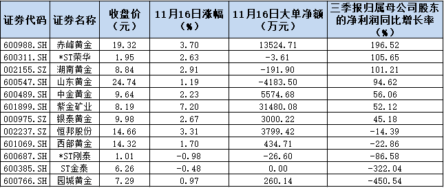 持續(xù)撤離的資金也終于“返身”入場?!蹲C券日報(bào)》記者根據(jù)同花順數(shù)據(jù)統(tǒng)計(jì)發(fā)現(xiàn),11月16日,黃金板塊結(jié)束連續(xù)5個交易日凈流出態(tài)勢,吸金逾5億元。具體來看,板塊內(nèi)7只黃金股獲大單資金青睞,紫金礦業(yè)、赤峰黃金等兩只個股大單資金凈流入超1億元,分別為31480.08萬元、13524.71萬元,其他呈現(xiàn)大單資金凈流入的個股還有,中金黃金、恒邦股份、銀泰黃金、西部黃金、園城黃金。這7只個股大單資金凈流入達(dá)到5.81億元。