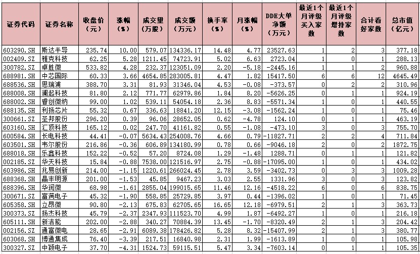 行業(yè)景氣的提升也促使機構(gòu)評級者看好相關(guān)股票,從最近一個月的機構(gòu)評級中來看,有24只個股獲機構(gòu)給予“買入“或“增持”等看好評級,其中,中芯國際得到看好評級家數(shù)最多,達12家,華潤微獲得6家機構(gòu)看好評級,長電科技獲得4家機構(gòu)看好評級。