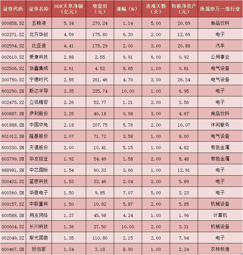 一、周一(12月7日)DDE大單資金凈買入TOP20