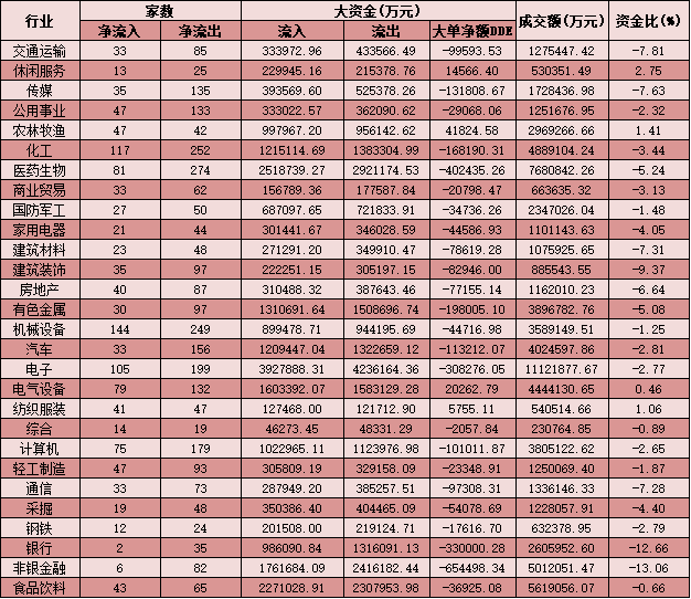 二、周一(12月7日)申萬一級行業(yè)大單資金流向