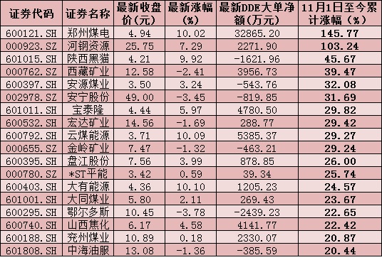 表:采掘行業(yè)中11月1日至今累計漲幅超20%的個股情況: