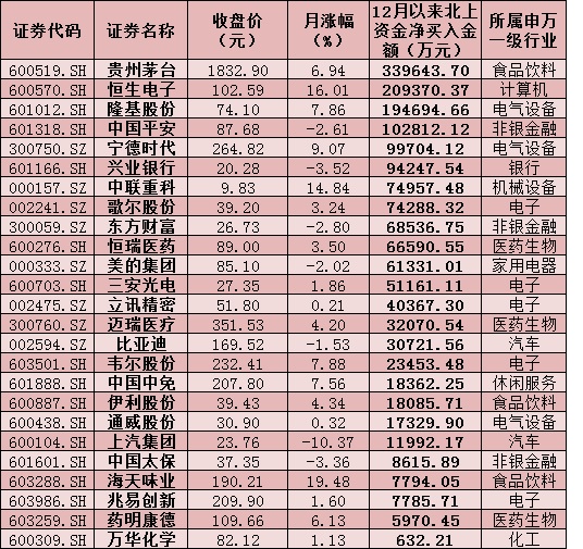 表:12月份以來北上資金凈買入的25只個股情況: