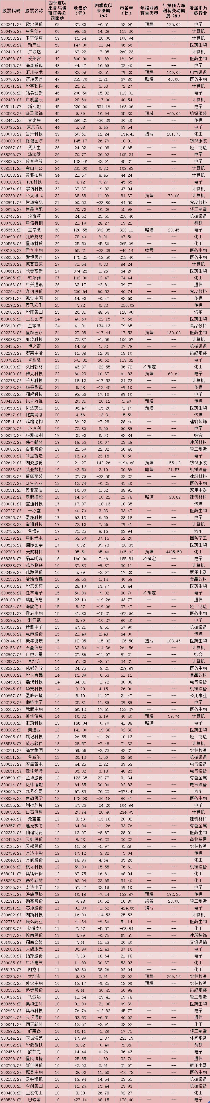 表:四季度以來參與調(diào)研的券商家數(shù)在10家及以上個(gè)股一覽