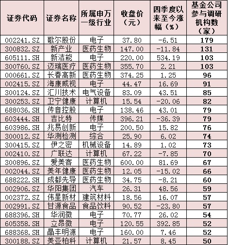 表:四季度以來參與調(diào)研的基金公司家數(shù)在50家及以上個股一覽
