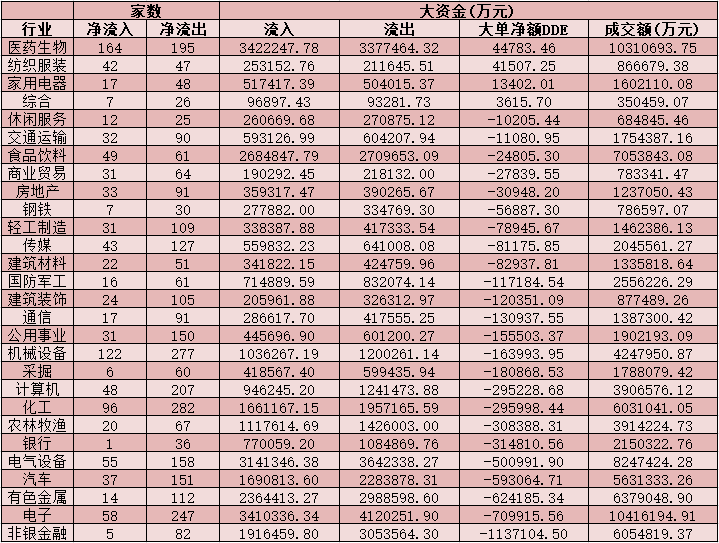 從資金層面看,今日A股大單資金整體凈流出594.94億元,其中,有1024只個股凈流入,3038只個股凈流出。從申萬一級的28個行業(yè)來看,有4個行業(yè)呈現(xiàn)大單資金凈流入態(tài)勢,其中,醫(yī)藥生物行業(yè)資金凈流入居首,達(dá)4.48億元,緊隨其后的是紡織服裝,大單資金凈流入為4.15億元,此外,家用電器和綜合等兩行業(yè),也均實現(xiàn)大單資金凈流入。另外,非銀金融、電子、有色金屬等三行業(yè)資金凈流出均超6億元。