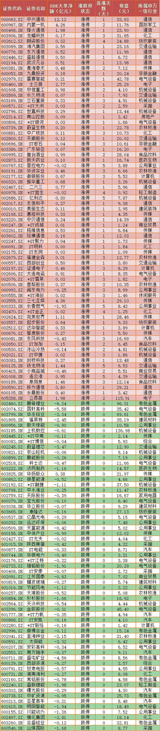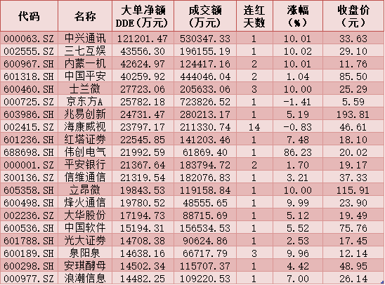 一、周二(12月29日)DDE大單資金凈買入TOP20