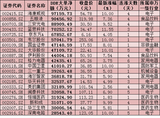 一、周二(1月5日)DDE大單資金凈買入TOP20