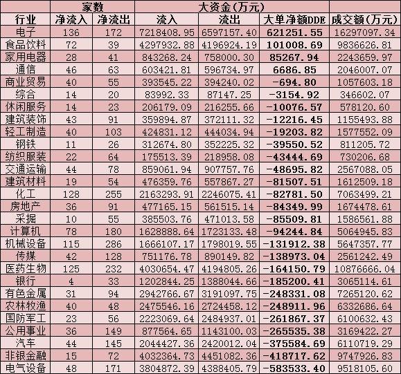 二、周二(1月5日)申萬一級行業(yè)大單資金流向