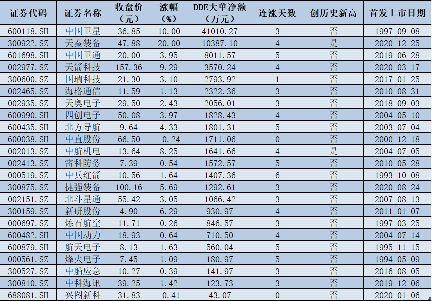 除了機(jī)構(gòu)看多呼聲日益高漲,大單資金也在積極布局?!蹲C券日?qǐng)?bào)》記者根據(jù)同花順數(shù)據(jù)統(tǒng)計(jì)發(fā)現(xiàn),1月5日,23只國(guó)防軍工股呈現(xiàn)大單資金凈流入態(tài)勢(shì),合計(jì)大單資金凈流入8.60億元。其中,15只個(gè)股大單資金凈流入超1000萬元,中國(guó)衛(wèi)星和天秦裝備大單資金凈流入均在1億元以上,分別為4.10億元和1.04億元,此外,中國(guó)衛(wèi)通、天箭科技、國(guó)瑞科技、海格通信、天奧電子等5只個(gè)股大單資金凈流入也均在2000萬元以上,上述7只個(gè)股大單資金凈流入就達(dá)7.02億元。