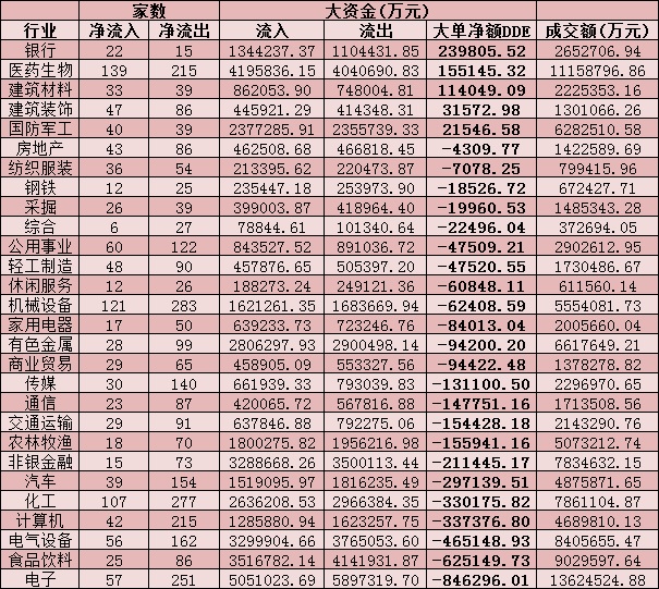 從資金層面看,今日A股大單資金整體凈流出373.9億元,其中,有1125只個股呈現(xiàn)資金凈流入,2910只個股呈現(xiàn)資金凈流出。從申萬一級的28個行業(yè)來看,有5個行業(yè)呈現(xiàn)大單資金凈流入態(tài)勢,其中,銀行、醫(yī)藥生物、建筑材料等三行業(yè)資金凈流入均超10億元,分別為23.98億元、15.51億元和11.4億元,緊隨其后的是建筑裝飾、國防軍工等兩行業(yè)。另外電子、食品飲料、電氣設備等行業(yè)資金凈流出均超40億元。
